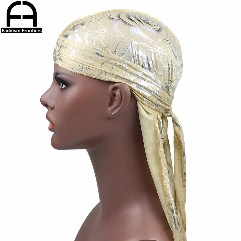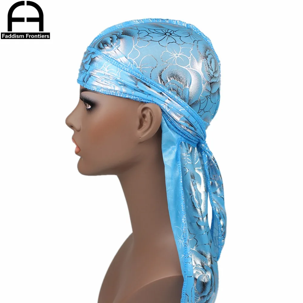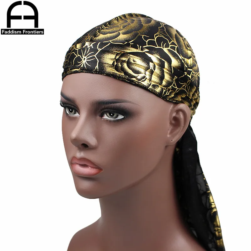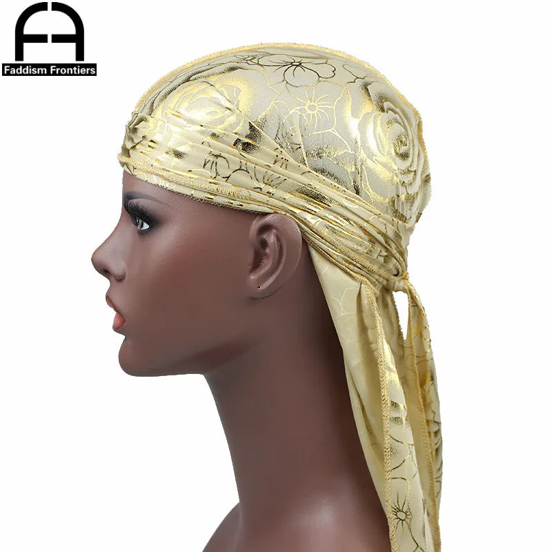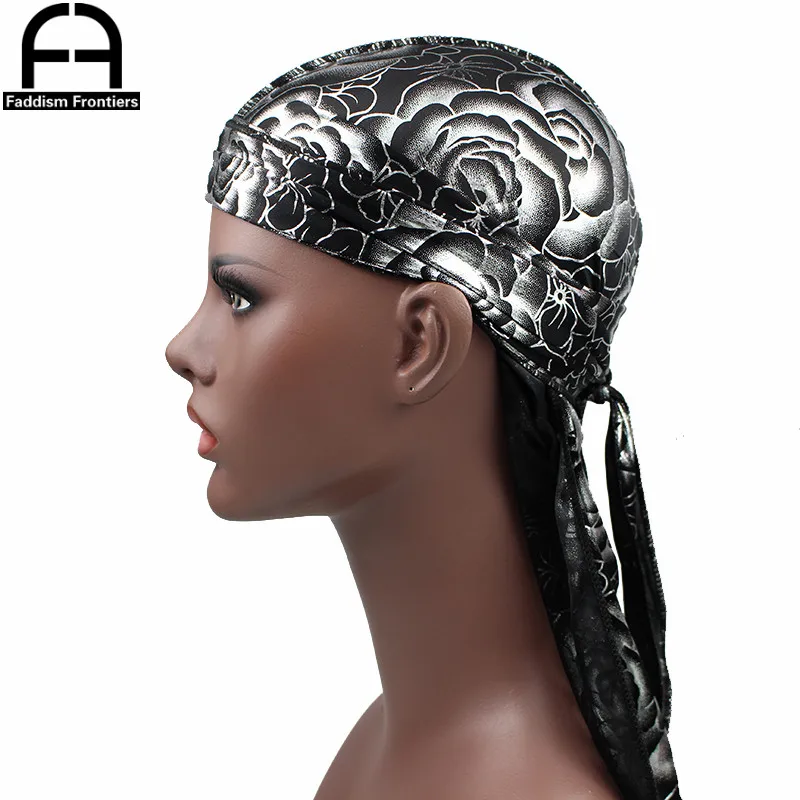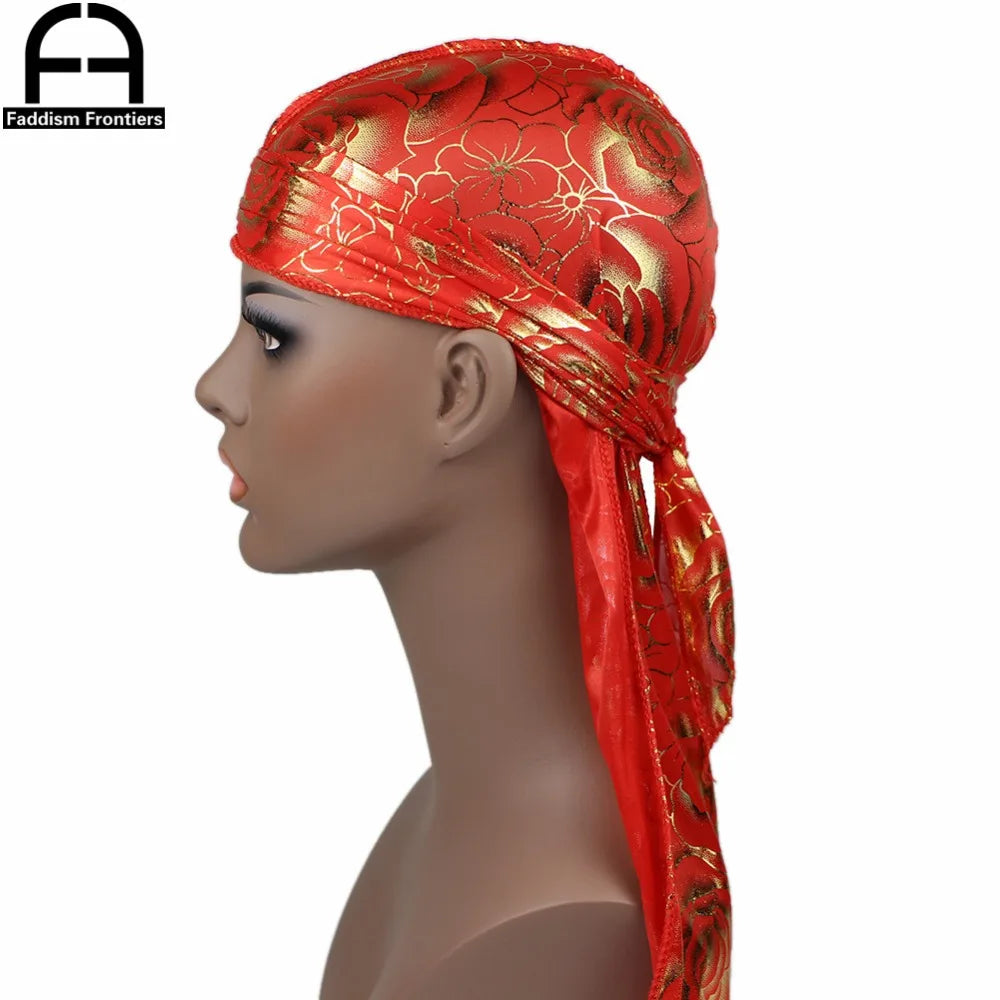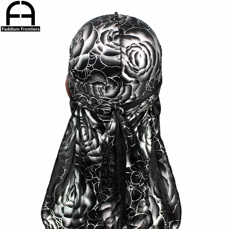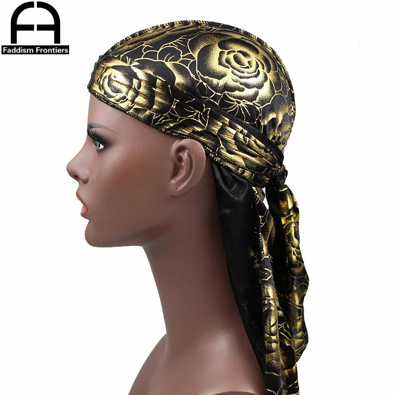 Custom Men's Print Silky Durags Turban Hat Bandanas Headwear Rose Printed Men Silk Durag Long Straps Waves Hair Accessories