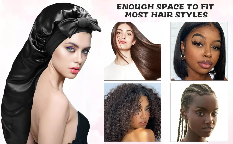 Women Extra Large Hair Long Silk Bonnet Cap & Elastic Satin Hair Band Comfortable Head Cover Night Sleep Hat for Sleeping Shower